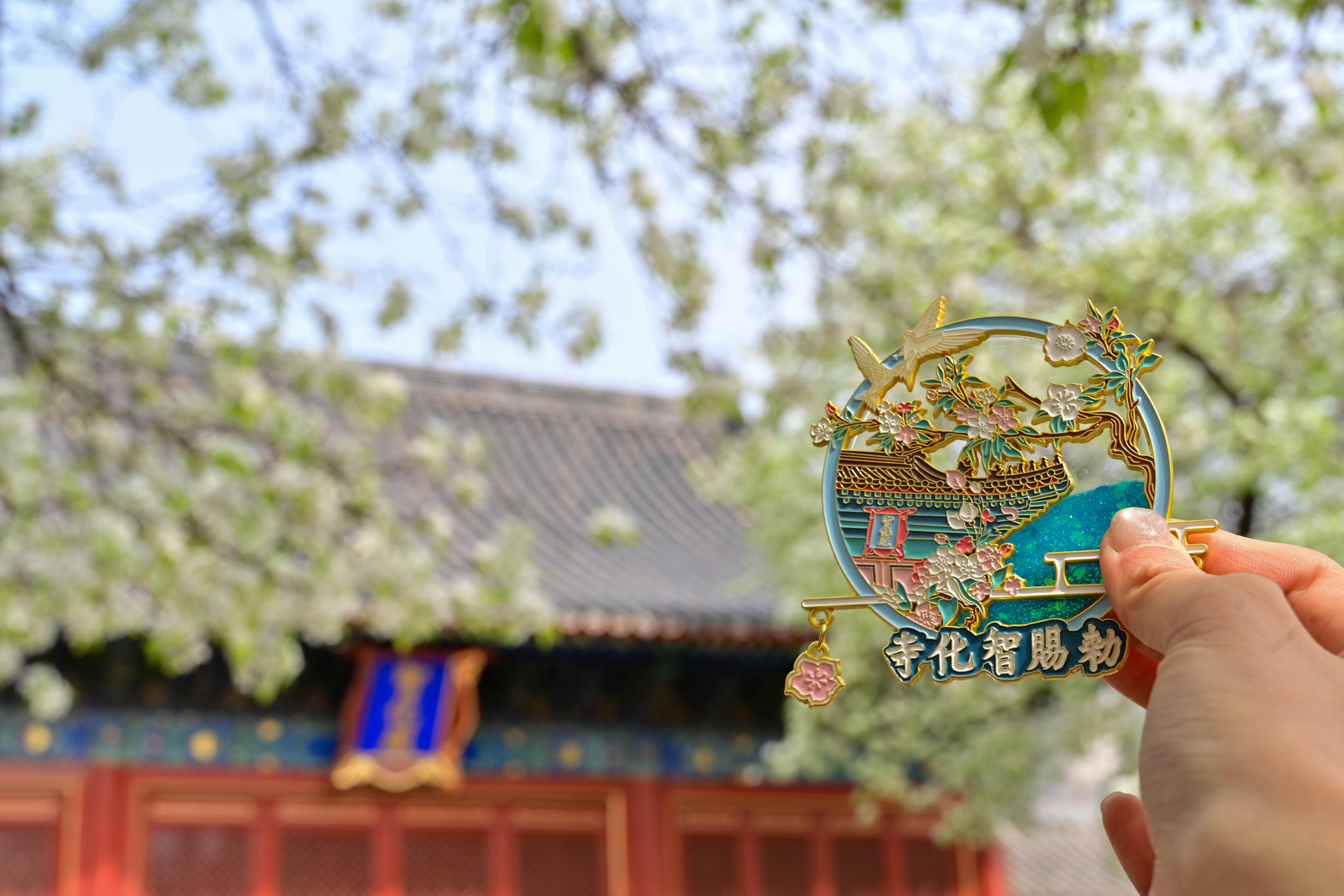 观众手持梨花主题冰箱贴在智化寺拍照留念。