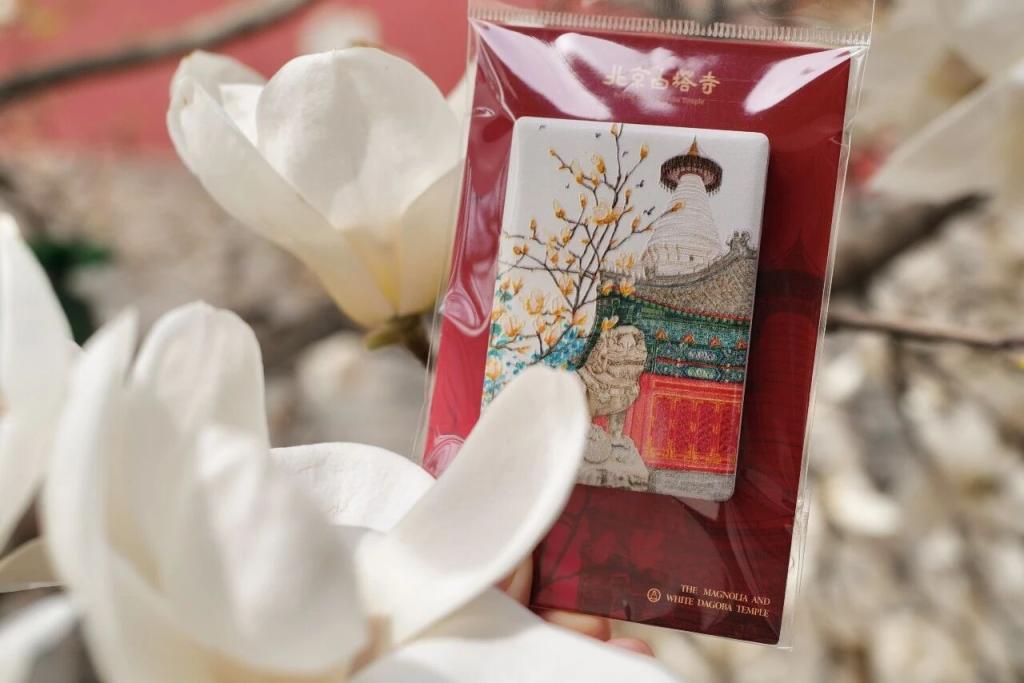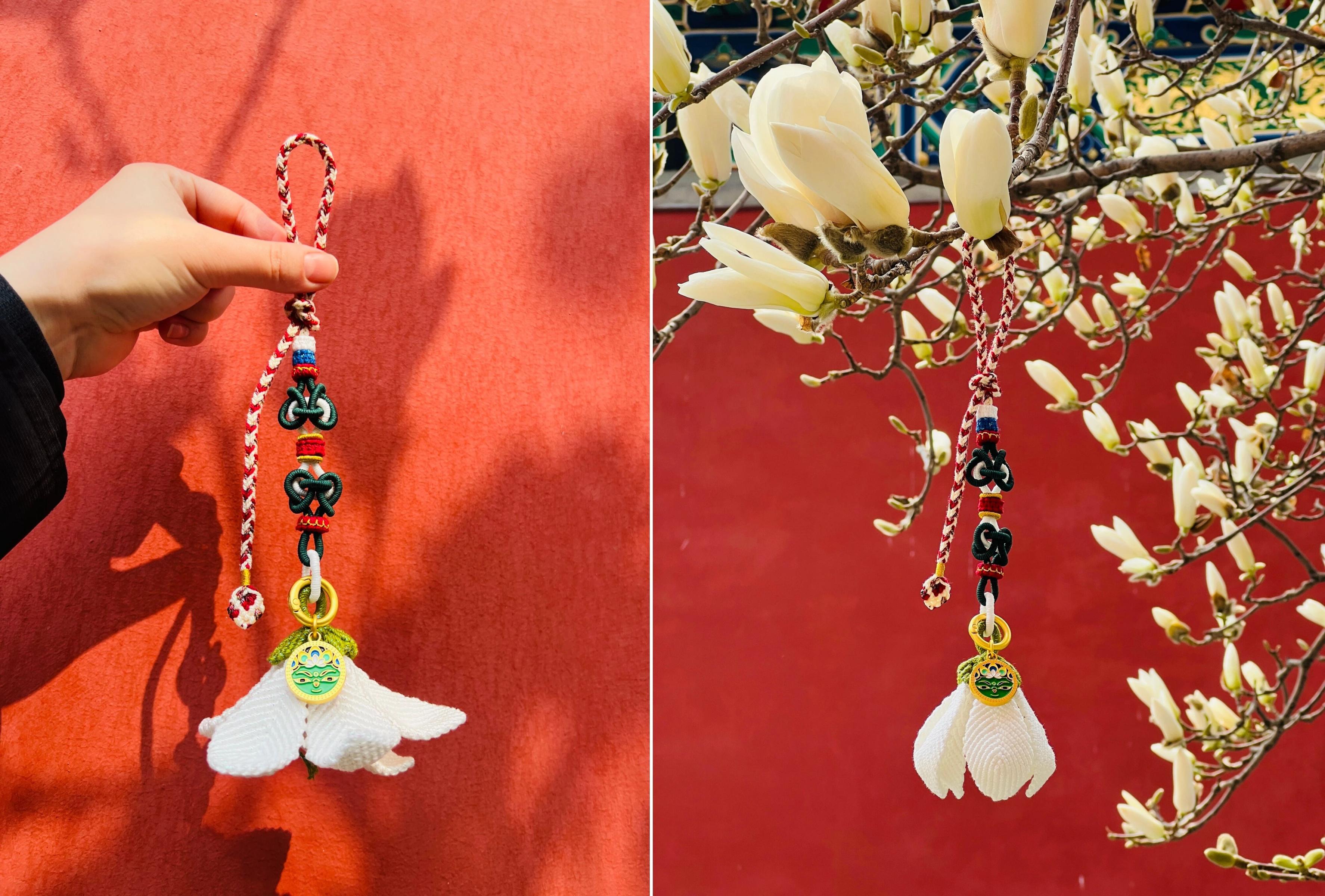 紧跟潮流的白塔寺管理处更是一口气儿上新了多款春日文创。该馆副主任顾莹介绍,最火的一款“妙兰盛遂·白塔寺玉兰挂饰”,1:1复刻了一朵白塔下的玉兰花,每个花瓣皆可打开,呈现玉兰由含苞到绽放的舒展姿态。“设计师还给这朵玉兰赋予了文化内涵。挂饰以手工马鞍结为骨,一结一扣,寓意平安牢固、步步顺遂。纯手工编制的玉兰更有质感、更具温度,很多观众购买后会拿着它与白塔、玉兰同框合影。这也是一种博物馆文化的二次传播。”