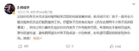 搜狐娱乐消息,2月25日,郑成华发文回应有关大壳(女儿)未按时缴纳税务罚款的传闻,称此传闻不实。