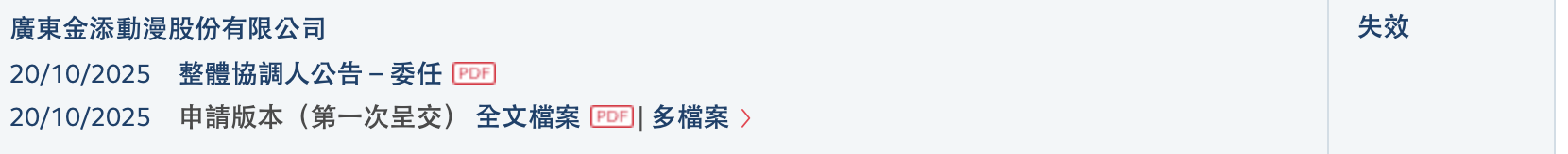 自广东金添动漫股份有限公司去年10月20日递交港股招股书后,满6个月仍无进展,记者查询港交所网站看到,其状态已经更新为“失效”。